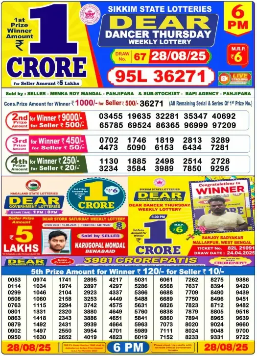 The results for the much-awaited Lottery Sambad 28 August 2025 (6 PM Draw) have been declared. The Dear Dancer Thursday Weekly Lottery, conducted under Sikkim State Lotteries, has brought smiles and excitement to thousands of participants across India.