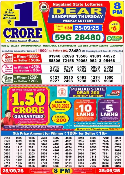 The Lottery Sambad Dear Sandpiper Thursday Weekly Lottery results for 25 September 2025 (8 PM Draw) have been officially declared. Players across Nagaland and beyond were eagerly waiting to see if luck favored them in this popular weekly lottery. Below, we bring you the complete list of winners including the jackpot, consolation prizes, and other categories.