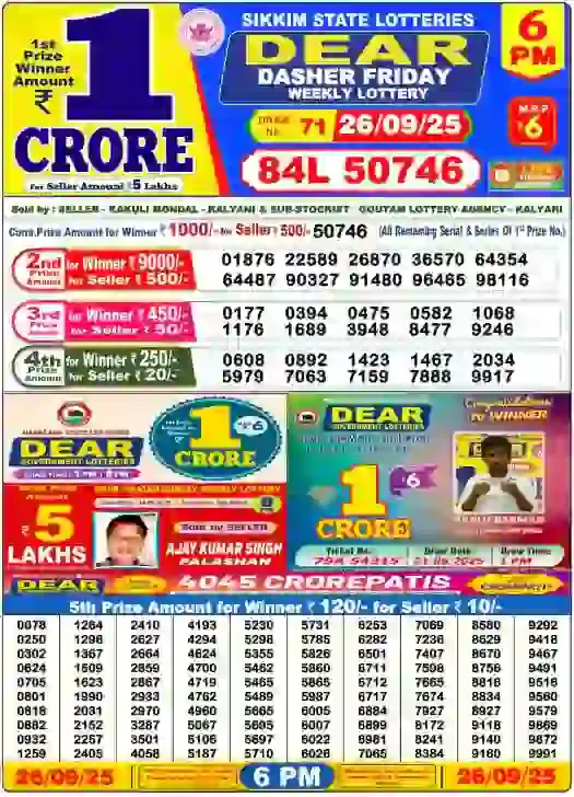 The Nagaland State Lottery has released the official results for the Dear Dasher Friday Weekly Lottery, held on 26 September 2025 at 8 PM. Thousands of hopeful participants waited eagerly to see if they struck gold in this popular weekly draw. Below, you’ll find the complete winners list including the jackpot, consolation prizes, 2nd, 3rd, 4th, and 5th prize numbers.