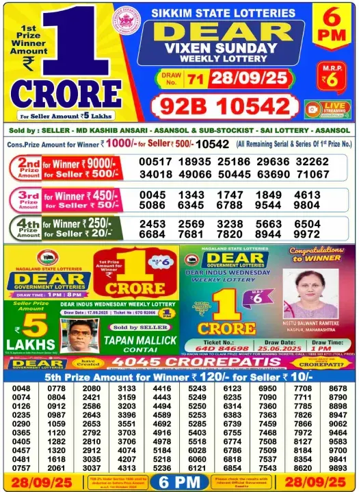 The second Sunday draw is the Vixen Sunday Lottery Sambad, held at 6 PM in the evening. This draw is very popular among working individuals who check the results after their day’s activities. The dear lottery result today 6 PM is searched by lakhs of players across India. The prizes include the 1st Prize worth ₹1 Crore and multiple other categories like 2nd Prize ₹9,000, 3rd Prize ₹500, and so on. To stay updated, check the live 6 PM results here: Nagaland State Lottery Result of Dear Morning 6 PM Live.