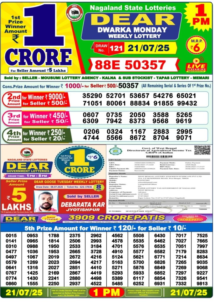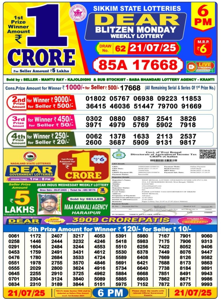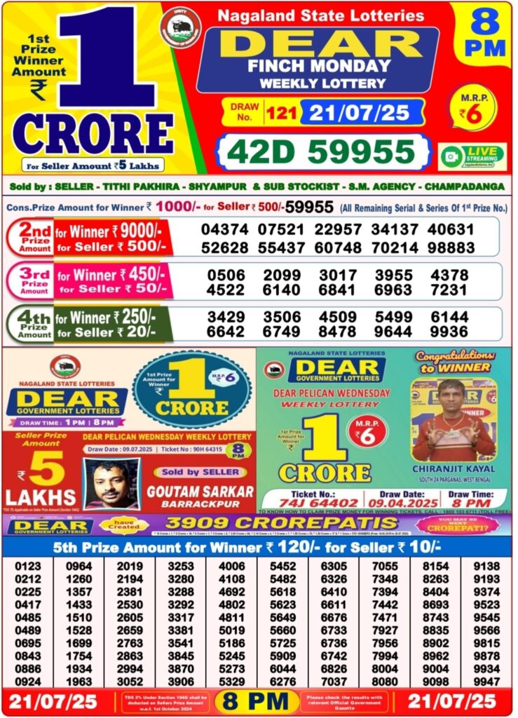 The official results for the Nagaland State Lottery Sambad for Monday, 21 July 2025, have been declared, bringing cheer and life-changing surprises to thousands of ticket holders across the country. The government-regulated draws were held under three popular weekly schemesβFinch Monday, Blitzen Monday, and Dwarka Mondayβand were conducted in a transparent manner using lotto machines under the supervision of officials.